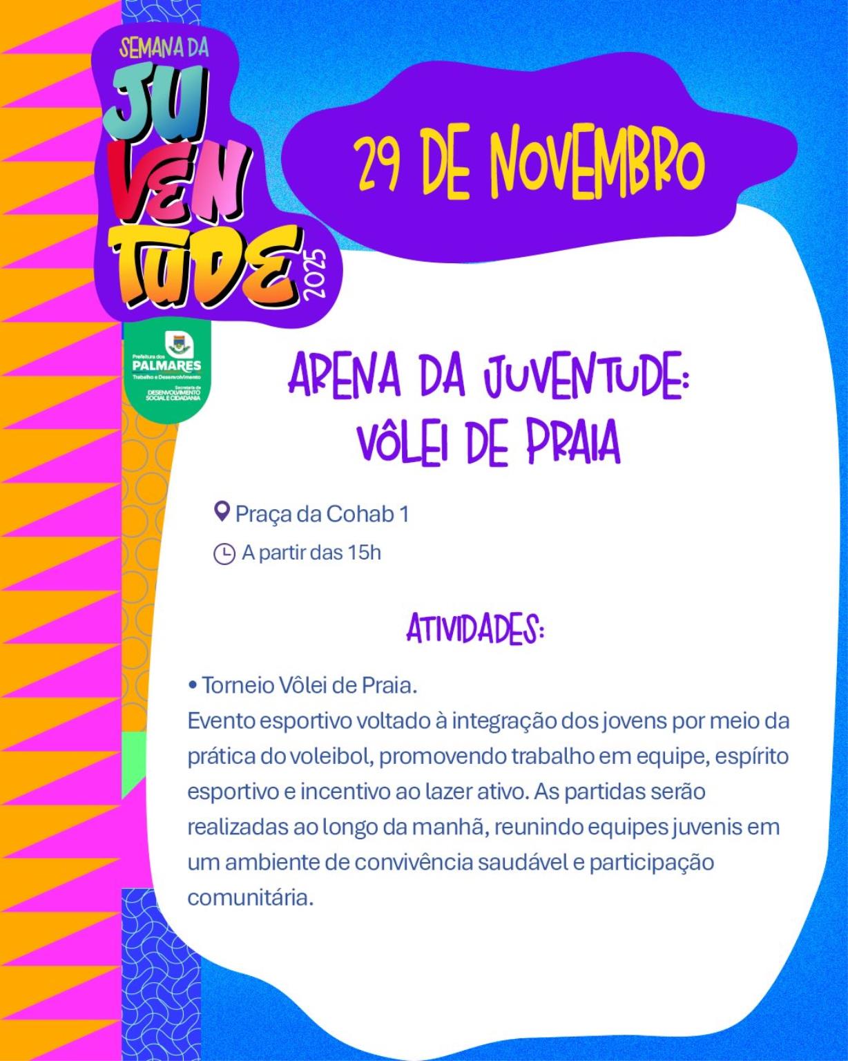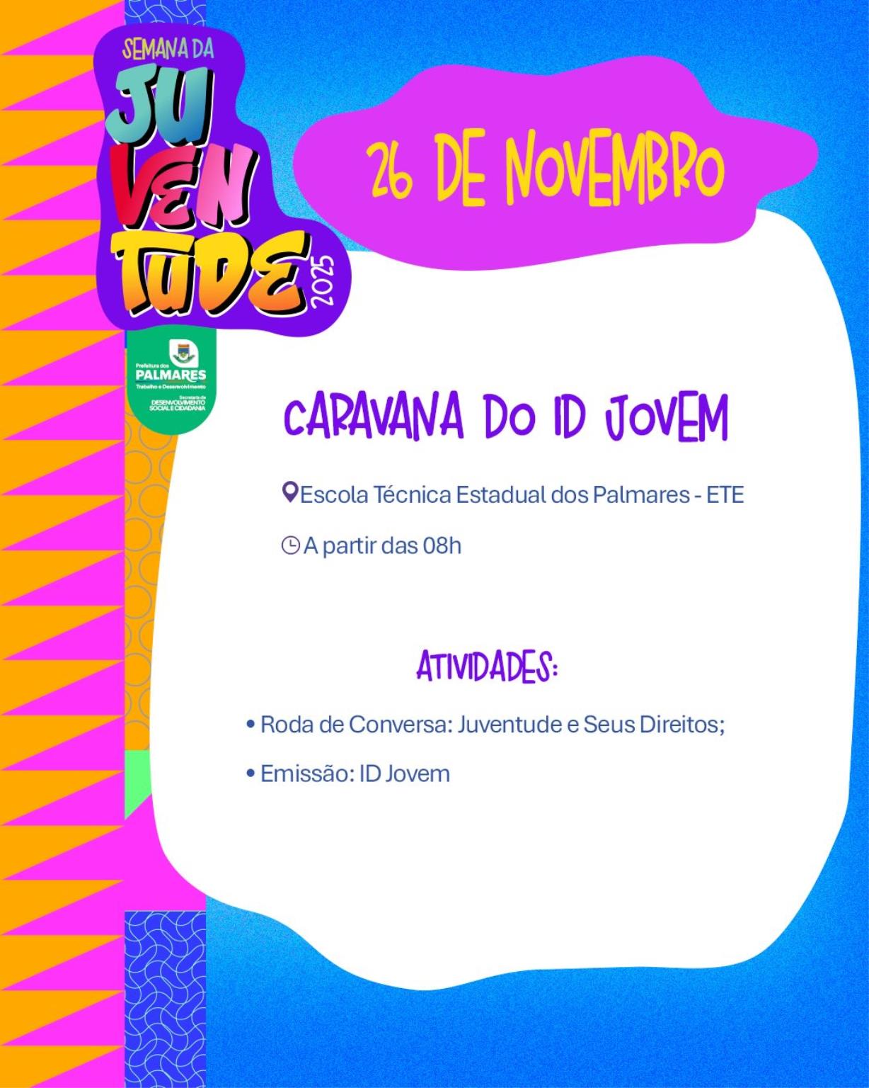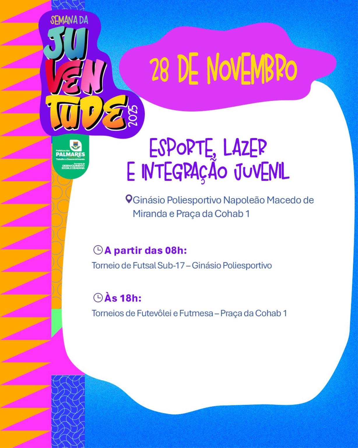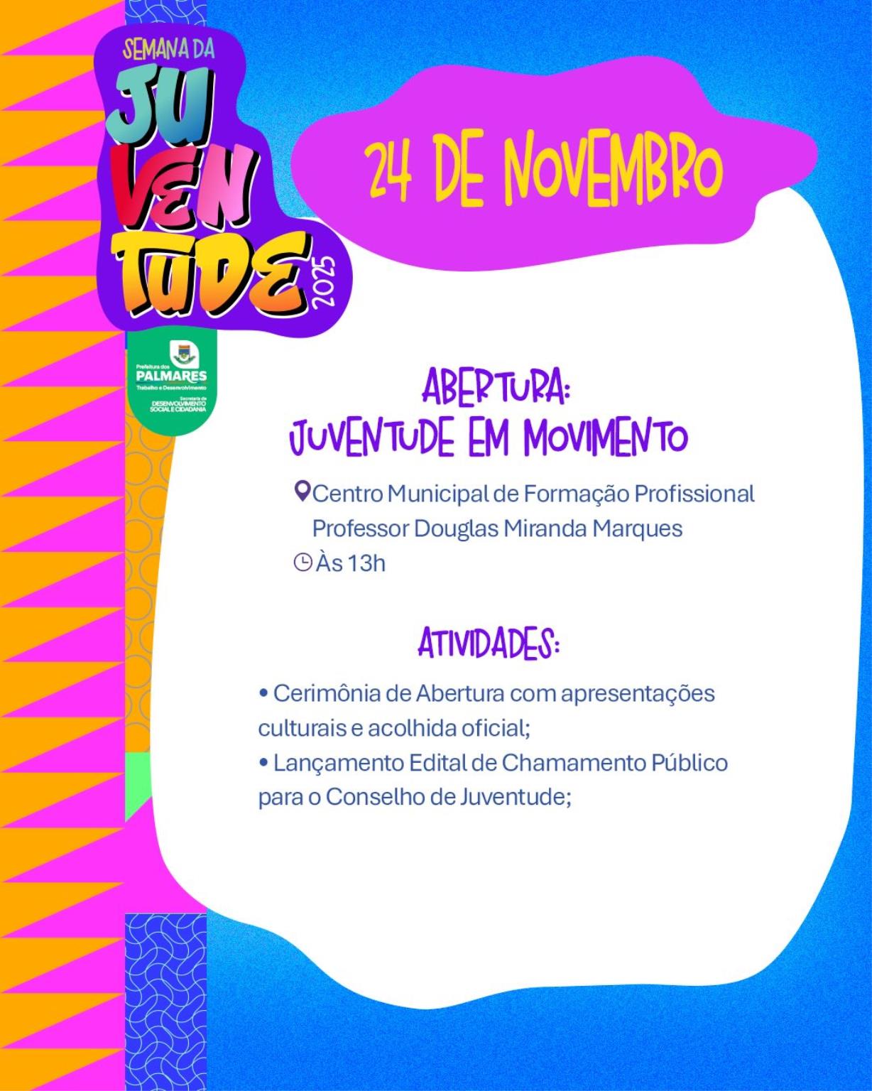 Fica ligado(a) e prepara a agenda — que será semana feita para inspirar, conectar e movimentar a juventude palmarense! 🌟