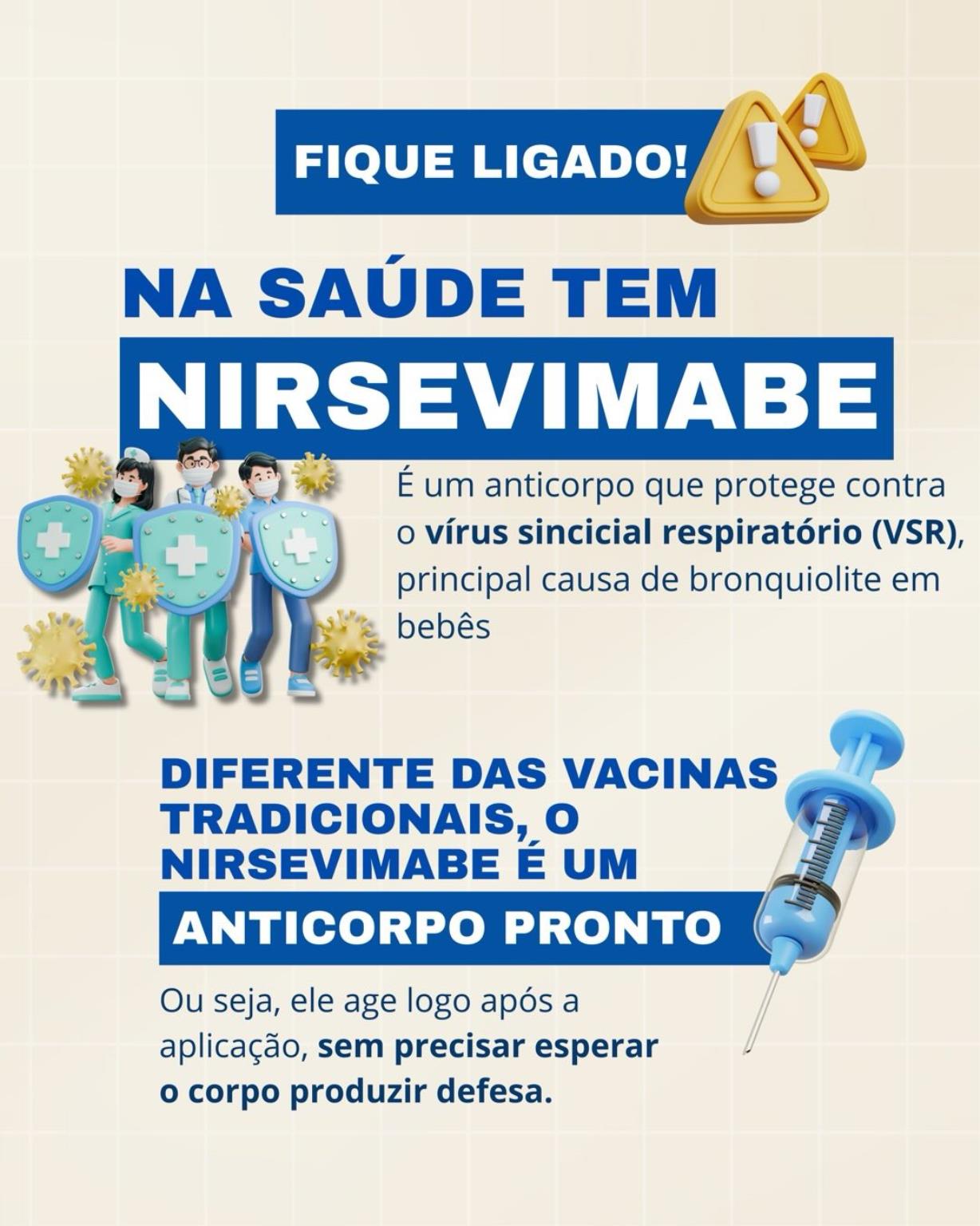 Informamos que o Nirsevimabe já está disponível nas Unidades Básicas de Saúde para proteção de bebês contra o Vírus Sincicial Respiratório (VSR), principal causa de bronquiolite na infância.