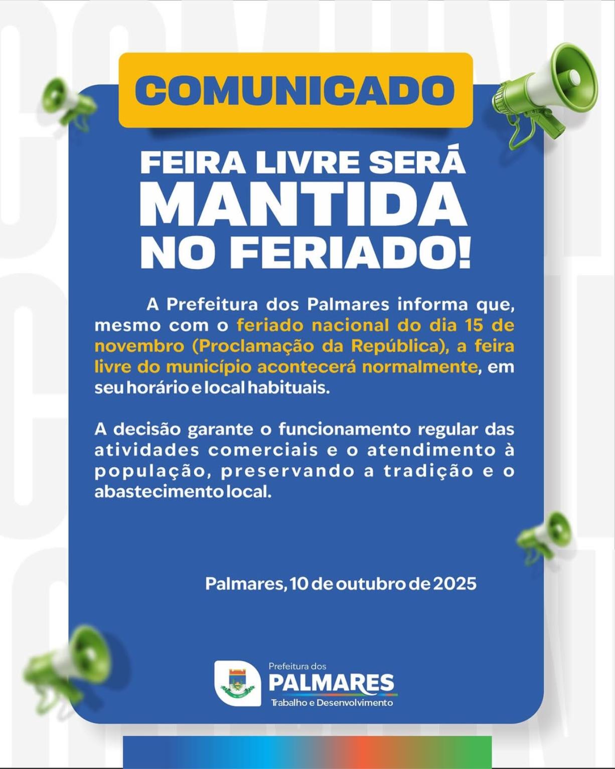 A Feira Livre Palmares será mantida normalmente no feriado nacional do dia 15 de novembro (Proclamação da República)!