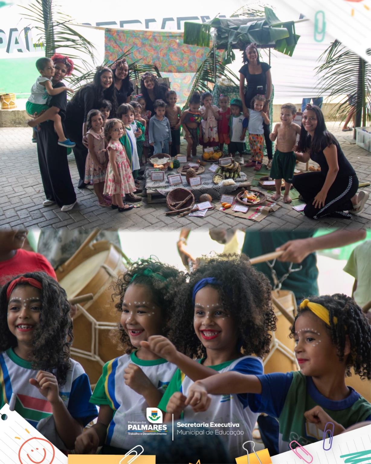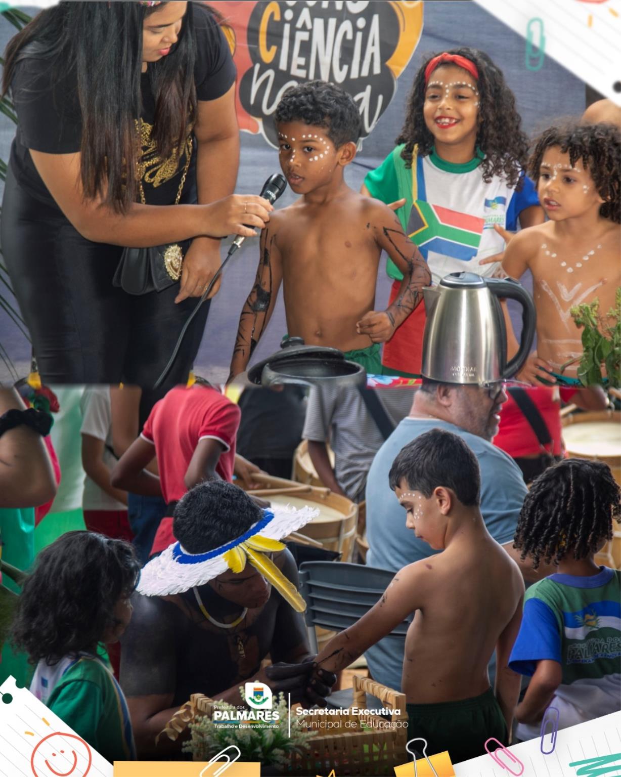 As crianças da Creche Municipal Violeta Griz demonstraram seu cuidado com a natureza ao apresentar plantas medicinais, dramatizações e encenações do conto “Cabelo de Lelê”, além de danças, brincadeiras, máscaras, raízes e sabores que destacaram elementos da culinária africana e indígena.