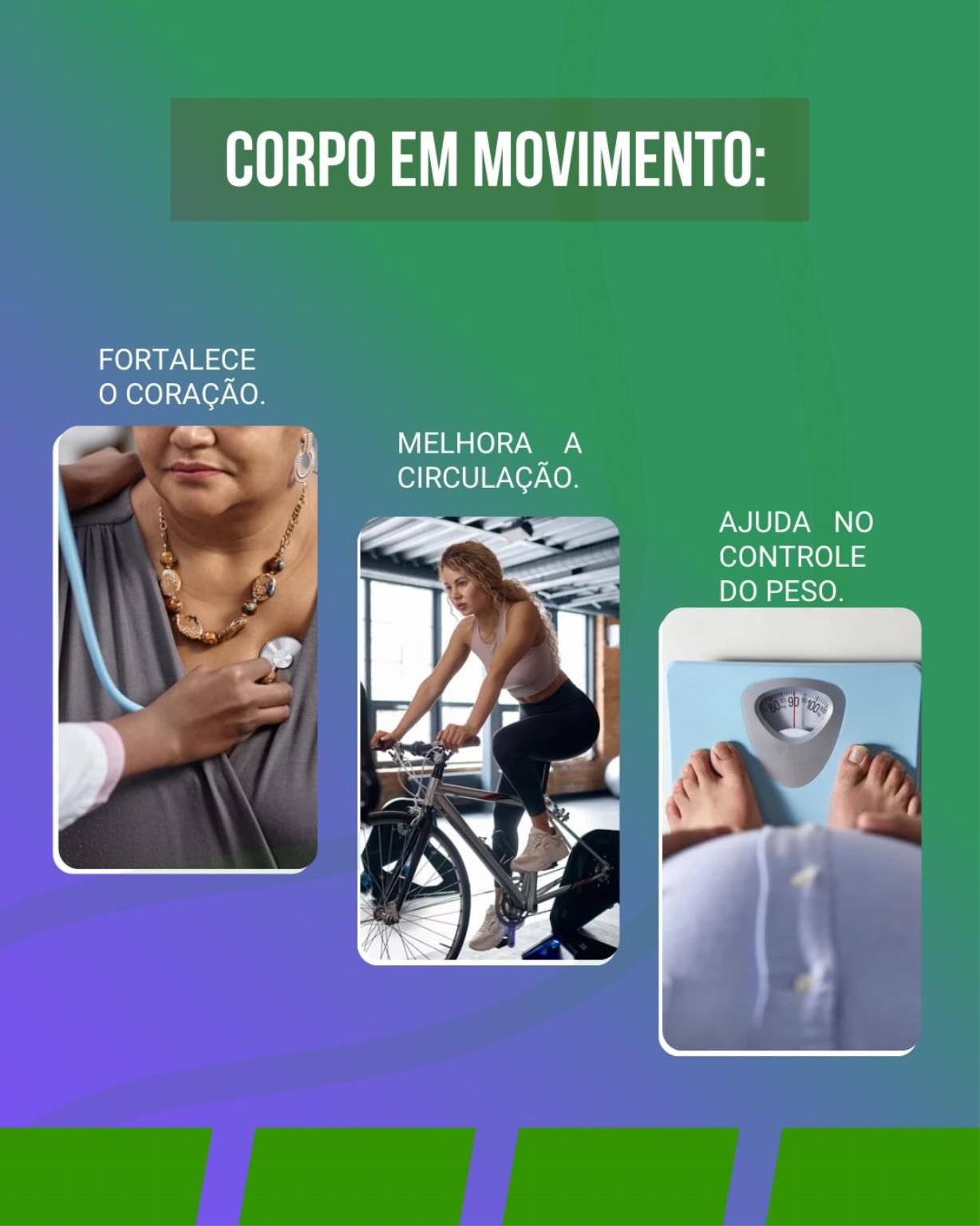 Movimentar o corpo fortalece o coração, melhora a circulação, ajuda no controle do peso e contribui para mais força, equilíbrio e autonomia no dia a dia. Além dos benefícios físicos, a atividade física também cuida da mente: reduz o estresse, melhora o sono e aumenta a disposição.