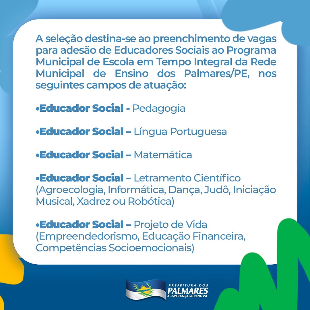 A Prefeitura dos Palmares, por meio da Secretaria Municipal de Educação, informa a abertura do Processo Seletivo para Educadores Sociais para atuação no Programa Escola em Tempo Integral.